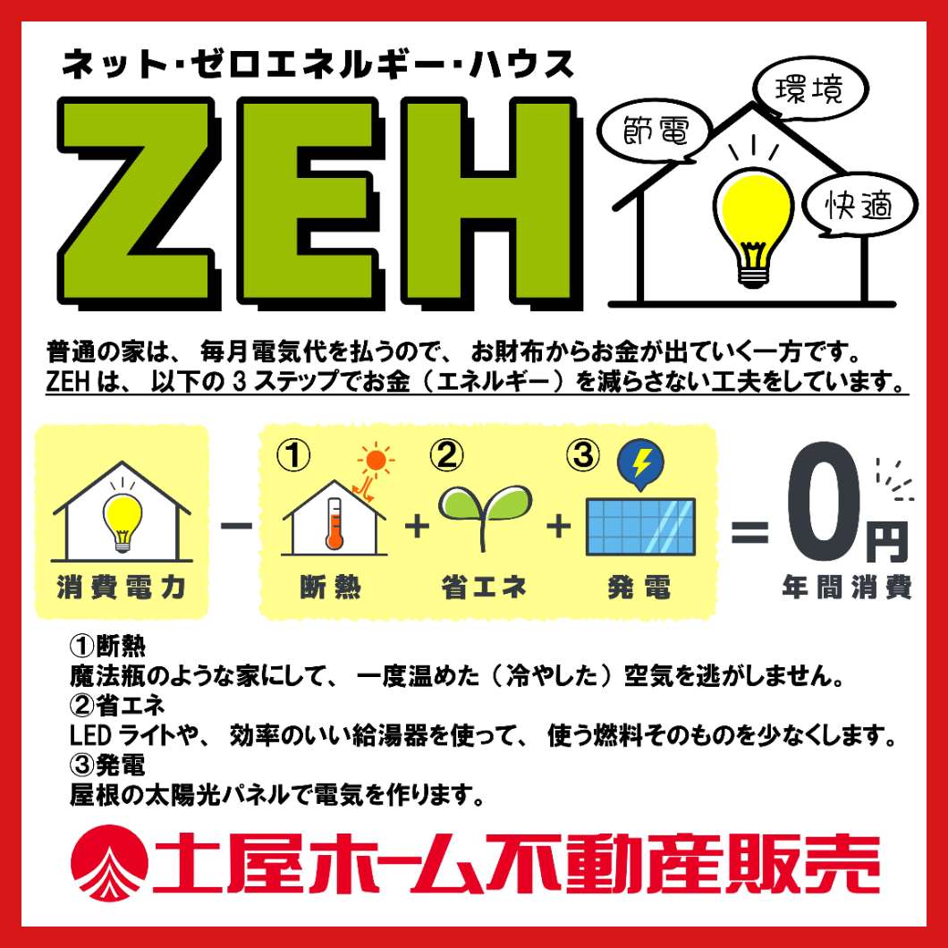 【ZEHとは】一生分の光熱費を「先に買い取る」住まい。初期費用はかかりますが、高い断熱性と太陽光発電で月々の支払いを実質0円以下に。家計を守り、一生モノの快適さを手に入れませんか?詳細は営業まで!