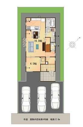 敷地面積約50坪で車3台駐車可能。緑豊かな自然に囲まれた吹抜け4LDK(真駒内)