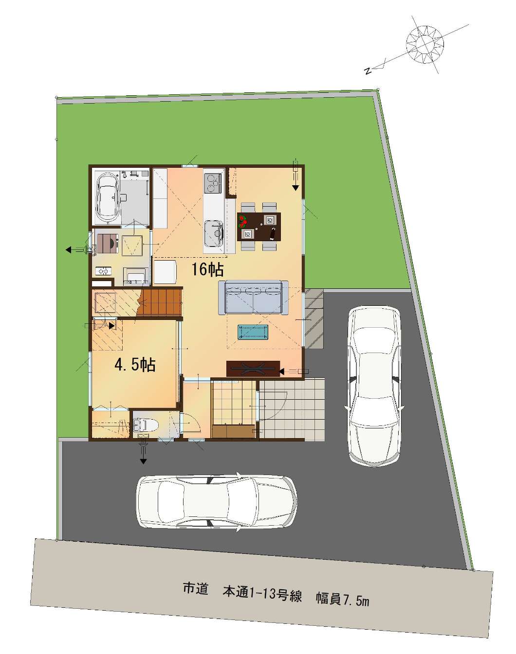 吹抜けで開放的なリビング空間に加え、陽当たりが良く明るく温かみのあるLDK。リビング横に4.5帖の洋室がありリビングがより広く感じられます。キッチンとダイニングスペースは縦に繋がりますので、家族の顔を見ながらのお料理や提供がスムーズです。2階は広くとったホールスペースと洋室3部屋。寝室として使う7.5帖の洋室にはウォークインクローゼットもあり収納力もあります。他2部屋は勉強机をあらかじめ設置いたしました。
