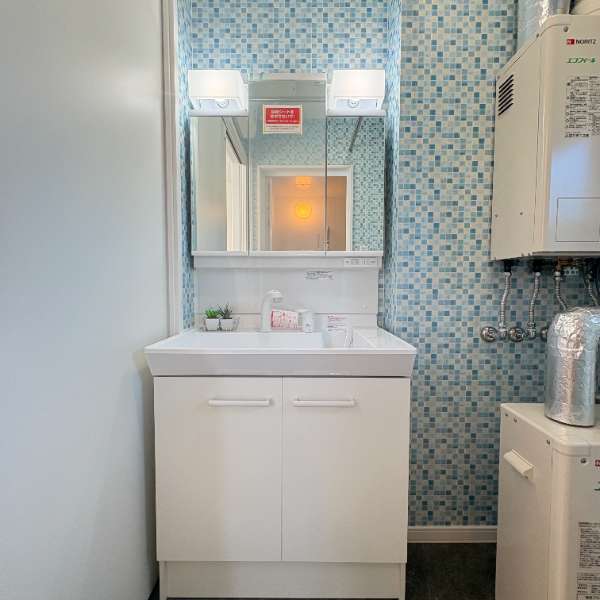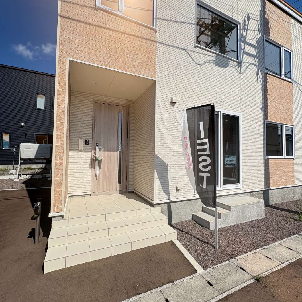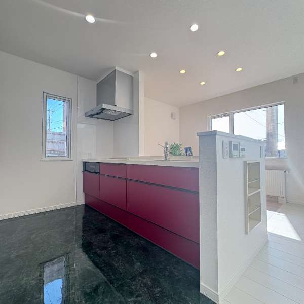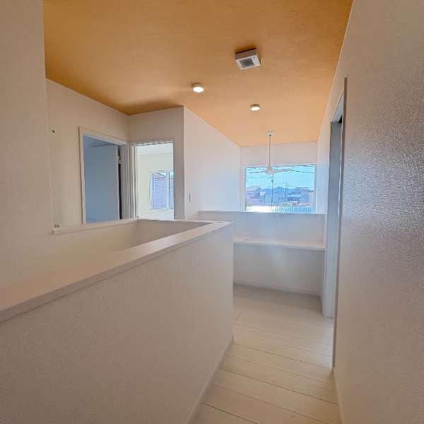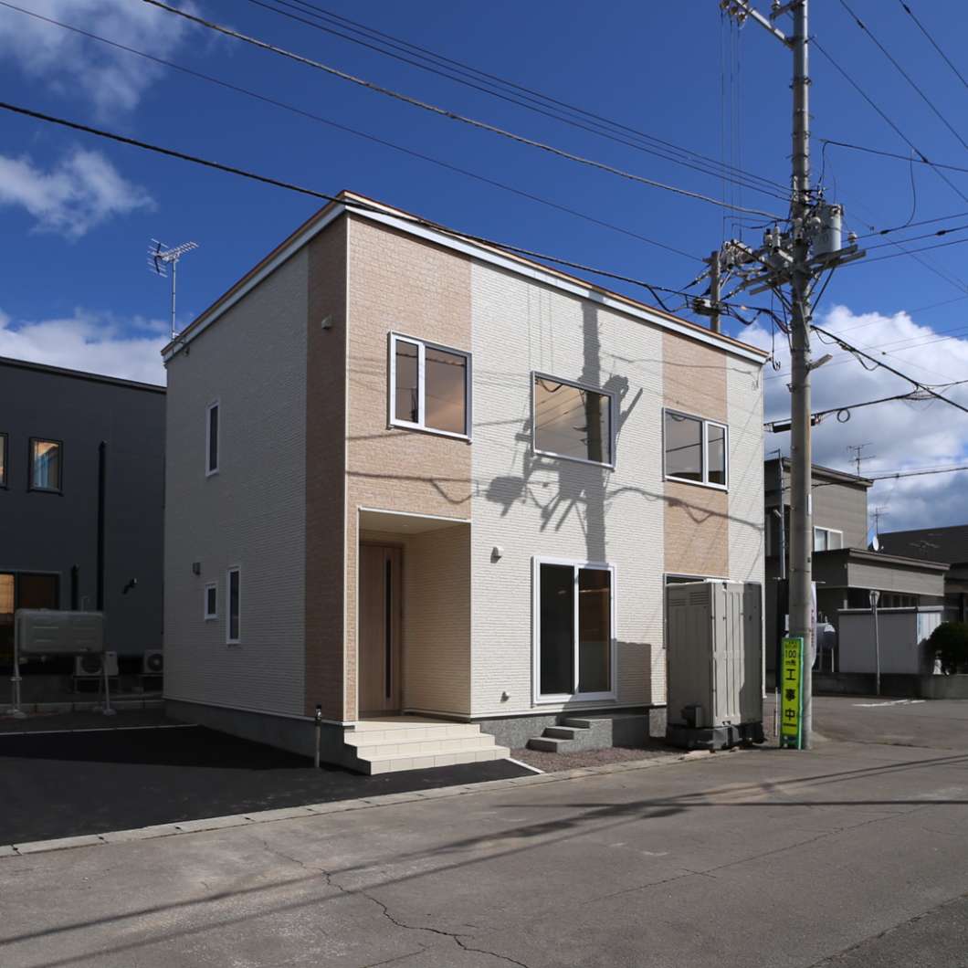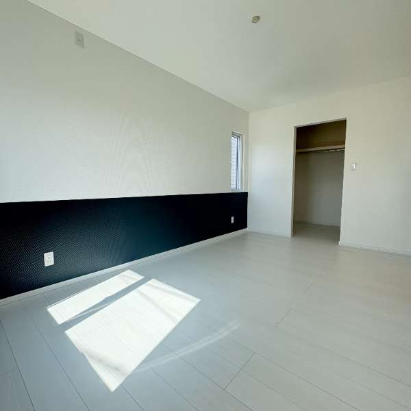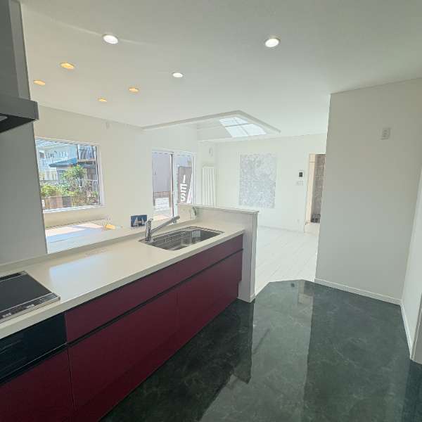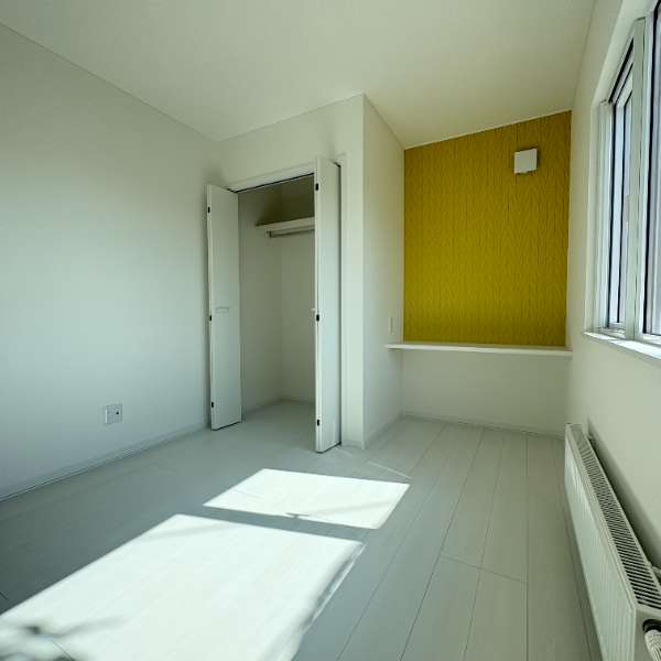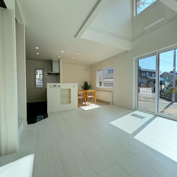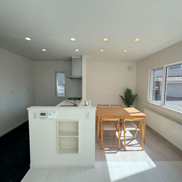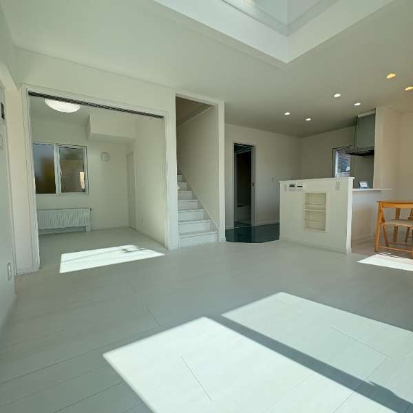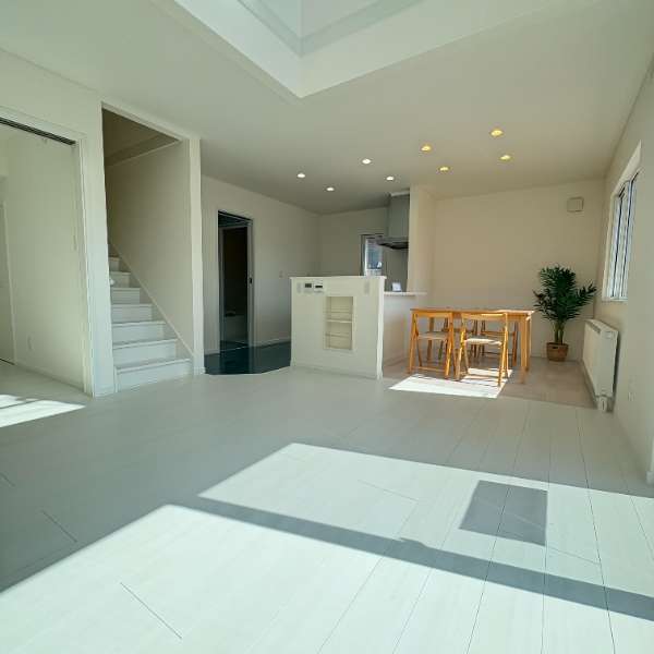 閑静な住宅街にある2階建4LDK、陽当たりの良さと空間の広さを感じ、ゆったりと過ごせる間取りです。全体的に白いクロスでまとめ明るさを取り入れ、キッチンや洗面脱衣場には差し色で雰囲気をがらりと変えてます。