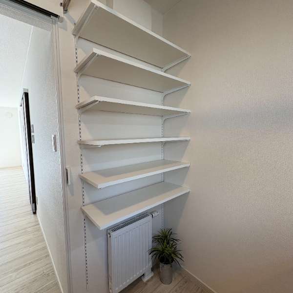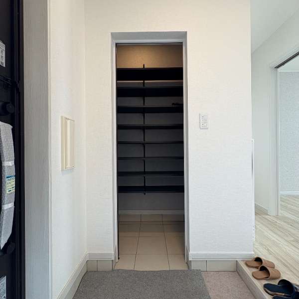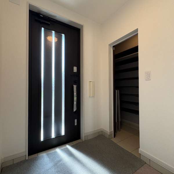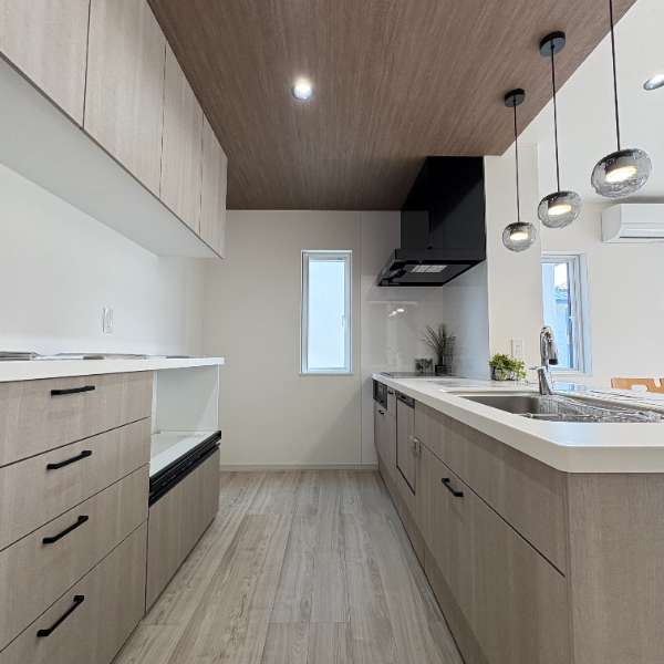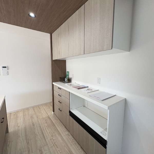 玄関にはシューズクロークがあり靴はもちろん、掃除用具やその他の収納にも最適なスペース!そのおかげで玄関はスッキリキレイを保てます。ビルトイン食洗機で家事負担を軽減、カウンターキッチンの背面には造り付けのカップボードも!洗面脱衣室も3帖と嬉しい広さでお洗濯のストレス軽減、家事効率をアップさせてくれます。LDKと居室が離れていますのでプライベート空間を確保し静かに暮らせます。
